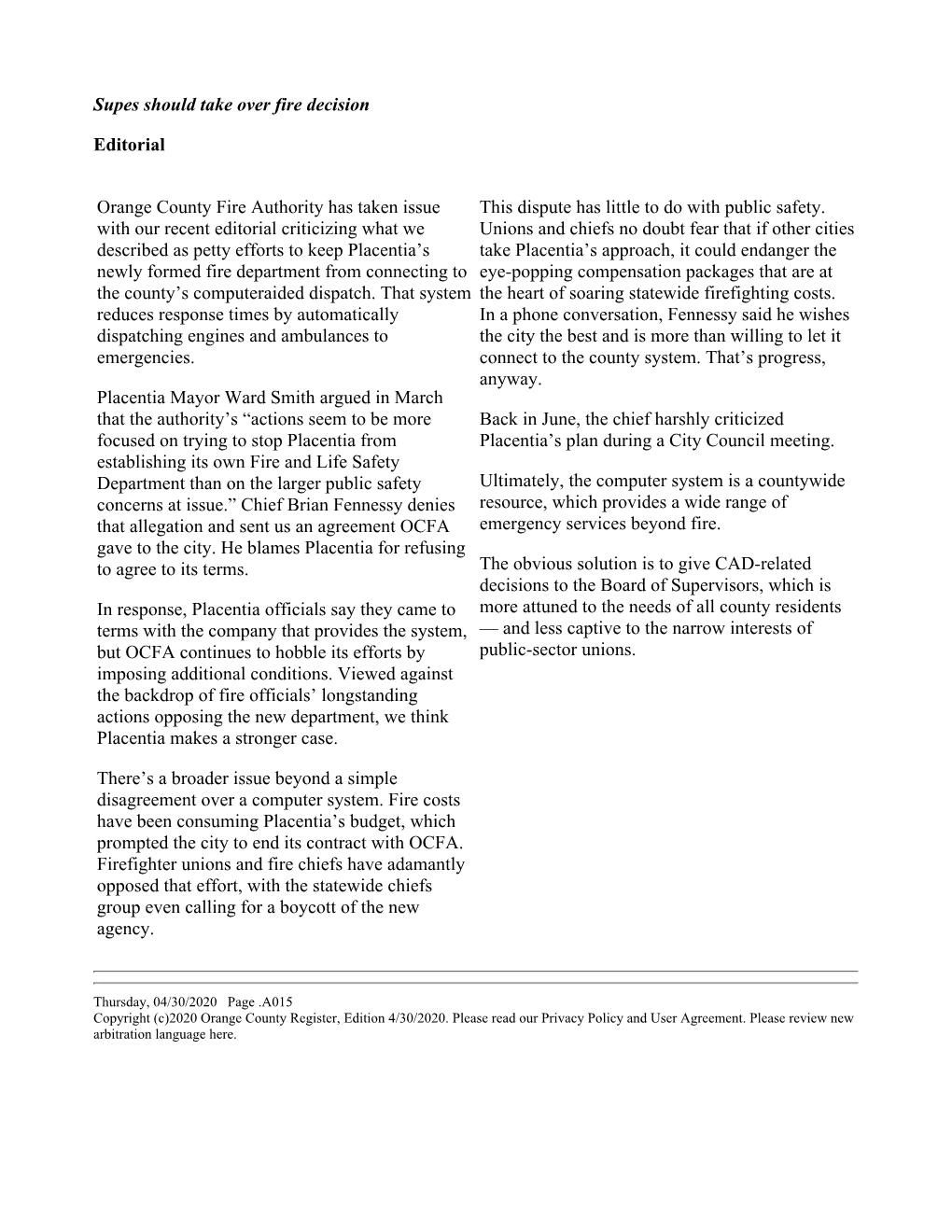 OCFA should immediately approve Placentia's CAD connection and stop putting union priorities over the safety of the general public.