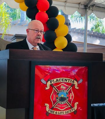Ward Smith delivering a speech to the members of the Placentia Fire & Life Safety Department during the Inaugural Badge Pinning Ceremony.